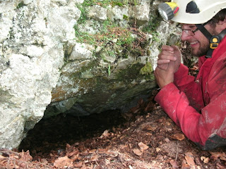 No, »fras« so mi povzročili pajki. Začudeno so me gledali, ne samo dva, ampak jih je bilo več, jaz bi rekel približno 9 komadov. Res težko rečem, ker so bili zelo veliki. Bili so to tisti pajki, ki imajo zelo veliko črno rit. Gledali so me z vsemi očmi, kar jih imajo. Nič jim ni bilo jasno, kaj delam jaz tu notri in jih motim pri druženju. Tako smo se gledali. Jaz z dvema velikima učkama, oni pa vsak s svojimi majhnimi osmimi učkami. Splazil sem ven in vzel palico. Odločil sem se, da grem notri. Takšna odločitev je padla, ker sem videl sigo in sem sklepal, da bi se rov lahko nadaljeval. Tako sem za palico šel v rov in pajkom povedal, da jih bom začasno pometal dol. Ko sem jih pometal dol, so se mi smejali, ker sedaj sem samo obrnil situacijo. Sedaj so bili na tleh. Malo sem razmetal listje, da sem jih zakril. Hitro sem se potegnil v jamo in bil navdušen, da se rov nadaljuje. Lepo sem puzal po rovu, ki se na koncu konča s steno, ki je zasigana, brez prepiha. Navdušen, da sem našel novo jamo, sem hitro spuzal spet mimo pajkov, ki so že prišli iz listja in se namestili na obrobje sten. Ko sem prišel ven sem začel klicati Leo in Gregija, naj se mi pridružita. Počasi sta prigrizla v hrib do mene. Šli smo do vhoda. Nisem se mogel odločiti, ali jim bi povedal za pajke, ker lahko bi se zgodilo, da bi meril sam. Malo sem olepšal zgodbo o pajkih in zlezel not. Sledil mi je Gregi in nato Lea. Ni prišlo do nobenega cviljenja, kar mi je malo olajšalo dušo. Po celem rovu se da lepo opazovati korenine, ki silijo iz površja v temo. Po tleh je grobo kamenje, ki je Leo spomnilo na idejo od Grega, ki bi iz jame pobral vse kamenčke itd... Z Gregijom sva začela meriti. Lepo sva merila čez ovinke ožine, vse do izhoda iz jame. V strmini, po kateri se spuzaš iz jame, je merilni laser totalno zaštekal. Tako sva se z Gregijom trudila, da se mu postavi v normalno ravnovesje delovanja. Ko sva se mučila, sva slišala Lejin glas, ki je previdno vprašal, ali bova kmalu končala. Rekla sva, da ja, da še malo. Ker sva po glasu predvidevala, da nekaj ni čisto v redu in da ima ta glas v sebi nekaj skrbi, sva pohitela in zaključila.