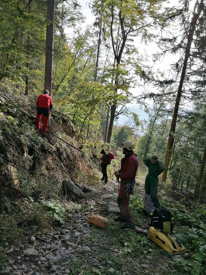 Vhod je tik ob gozdni vlaki, zato smo ga kmalu po najdbi jame zavarovali z rešetko. Malo smo očistili listje z rešetk, nato je Simon opremil vhod in eden za drugim smo se spustili 9 metrov nižje do delovišča.