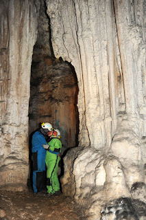Po kakšnih petih urah fotografiranja in raziskovanja jame sem postal nekoliko nestrpen, kajti nismo še odkrili ene izmed večjih znamenitosti jame: velik bel baldahin. Kolegi so mi pokazali nekaj kapnikov, ki pa niso bili to, kar sem iskal. Že na povratku se je Simon spustil na orjaško belkasto gobo, od tam pa do tako želenega baldahina, ki je bil skrit v drugi dvorani. Kapniška tvorba je res enkratna in sem prepričan, da zadosti še tako zahtevnega jamskega »popotnika«. Zaradi beline sige sem imel kar nekaj težav pri fotografiranju, kajti hitro se zgodi, da je posnetek »prežgan«. Ko sem se poslavljal od te naravne mojstrovine, se nisem pozabil zahvaliti Stvarniku. Povratek nazaj je bil zopet poglavje zase. Najprej sem brez večjih težav zmogel prečko, malce več težav je bilo pri žimarjenju, kajti tovrstnih izkušenj mi res manjka. S pomočjo Teje in Leje sem to zmogel in že v trdi temi sem se pridružil kolegom, ki so nas čakali pri vhodu. Omeniti je potrebno, da je preostala skupina z Albertom in Maksom odšla v drugo jamo, kjer se ni bilo potrebno spuščati po vrvi. Sledila je vožnja do Ilirske Bistrce, kjer smo prevzeli pizze in se odpeljali do Albertove hiše. »Velika družina« se nas je zbrala ob mizi, mastili smo se z odlično italijansko specialiteto. Naš pogovor o jamah in planinah se je zavlekel pozno v noč.
